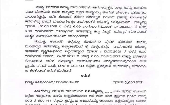 ಕಲಬುರಗಿ,ಮೇ.9 :ಕೋವಿಡ್ ಎರಡನೇ ಅಲೆ ನಿಯಂತ್ರಣ ನಿಟ್ಟಿನಲ್ಲಿ ರಾಜ್ಯ ಸರ್ಕಾರದ ಆದೇಶ ದಿ.07-05-2021ರ ನಿರ್ದೇಶನದಂತೆ ಕಲಬುರಗಿ ಜಿಲ್ಲೆಯಾದ್ಯಂತ ಮೇ 10ರ ಬೆಳಿಗ್ಗೆ 6 ಗಂಟೆಯಿಂದ ಮೇ-24ರ ಬೆಳಿಗ್ಗೆ