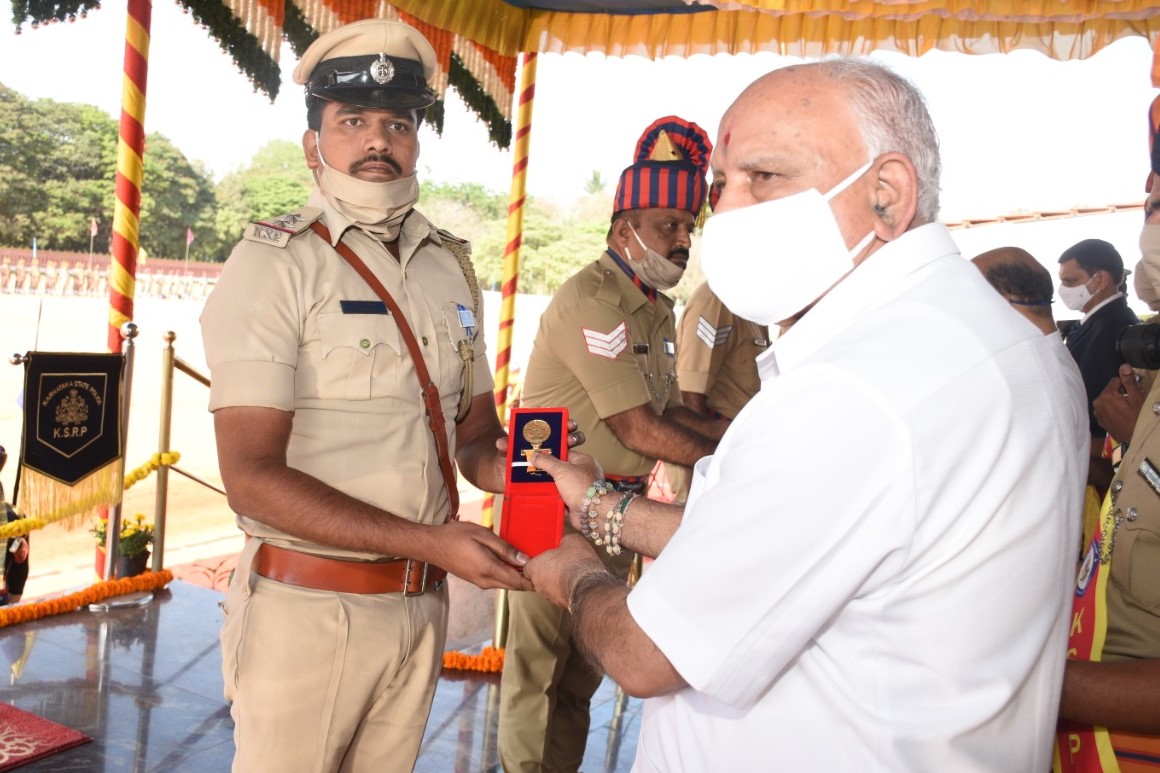 ಲಿಂಗಸುಗೂರು : ಸ್ಥಳೀಯ ಠಾಣೆ ಪಿಎಸ್ಐ ಪ್ರಕಾಶರೆಡ್ಡಿ ಡಂಬಳ್ರಿಗೆ ಮುಖ್ಯಮಂತ್ರಿ ಬಿ.ಎಸ್. ಯಡಿಯೂರಪ್ಪ ಪದಕ ನೀಡಿ ಗೌರವಿಸಿದರು.