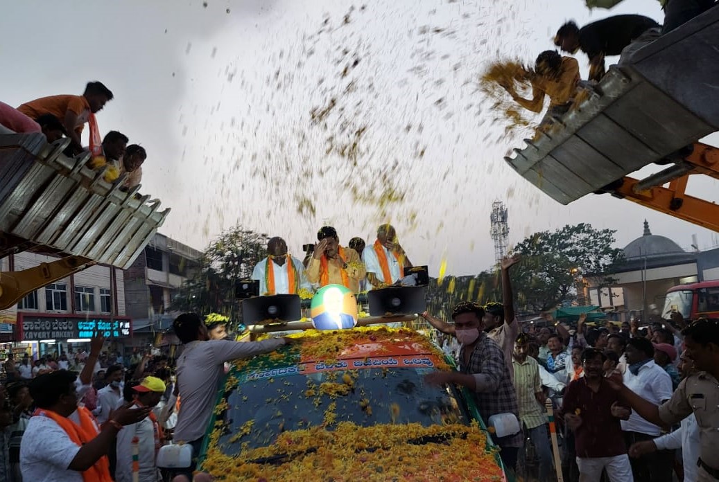 ಸ್ಥಳೀಯ ಬಸ್ಟಾಂಡ್ ವೃತ್ತದಲ್ಲಿ ತೆರೆದ ವಾಹನದಲ್ಲಿ ವಿಜಯೇಂದ್ರ ಆಗಮಿಸುತ್ತಿದ್ದಂತೆಯೇ ಎರಡು ಜೆಸಿಬಿ ಯಂತ್ರಗಳ ಬಕೆಟ್ಗಳಲ್ಲಿ ನಿಂತಿದ್ದ ಕಾರ್ಯಕರ್ತರು ಪುಷ್ಟಾಭಿಷೇಕ ಮಾಡಿದರು. ವಿಜಯೇಂದ್ರ ಹಾಗೂ ಮಾನಪ್ಪ ವಜ್ಜಲ್ರ ಪರವಾದ ಘೋಷಣೆಗಳನ್ನು ಕೂಗುತ್ತಾ,ಬೈಕ್ ರ್ಯಾಲಿ ಮೂಲಕ ಬಿಜೆಪಿ ಕಚೇರಿಗೆ ಕರೆತರಲಾಯಿತು.