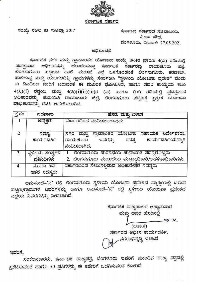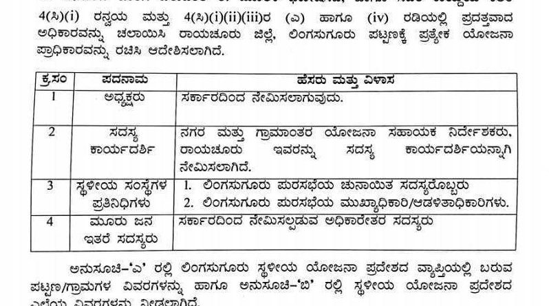 ಲಿಂಗಸುಗೂರು ಈಗ ಸ್ಥಳೀಯ ಯೋಜನಾ ಪ್ರದೇಶ : ಅಧಿಸೂಚನೆ