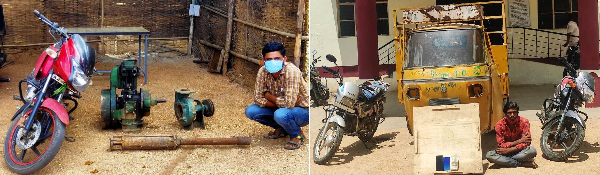 ರೋಡಲಬಂಡಾ ಗ್ರಾಮದ ಖಲೀಲ್ ಚಟನೂರು ಎನ್ನುವ ಆರೋಪಿಯಿಂದ ಪಂಪ್ಸೆಟ್, ಆಯಿಲ್ ಇಂಜಿನ್, ಬೋರ್ ಹಾಗೂ ಒಂದು ದ್ವಿಚಕ್ರ ವಾಹನ ಸೇರಿ 1.15 ಲಕ್ಷ ರೂಪಾಯಿ ಬೆಲೆ ಬಾಳುವ ಸಾಮಗ್ರಿಗಳನ್ನು ವಶಕ್ಕೆ ತೆಗೆದುಕೊಳ್ಳಲಾಗಿದೆ. ಹಾಗೆಯೇ, ಮಸ್ಕಿ ಪಟ್ಟಣದ ಹನುಮಂತ ಮೋಡಿಕಾರ ಎನ್ನುವ ಆರೋಪಿಯಿಂದ ಒಂದು ಅಟೋ, ಎರಡು ದ್ವಿಚಕ್ರ ವಾಹನಗಳು, 2 ಮೊಬೈಲ್, 5 ಸಾವಿರ ರೂಪಾಯಿ ನಗದು ಸೇರಿ 1.55 ಲಕ್ಷ ರೂಪಾಯಿ ಸೇರಿ ಇಬ್ಬರೂ ಆರೋಪಿಗಳಿಂದ ಒಟ್ಟು 2.70 ಲಕ್ಷ ರೂಪಾಯಿ ಬೆಲೆಯ ಸಾಮಗ್ರಿಗಳನ್ನು ವಶಕ್ಕೆ ವಶಪಡೆಯಲಾಗಿದೆ.