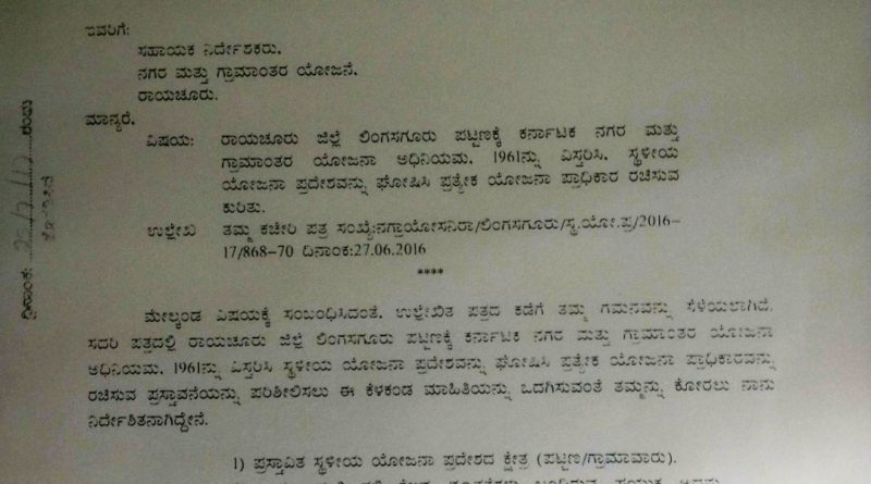 ಆ ಪತ್ರದಲ್ಲಿ ಲಿಂಗಸುಗೂರು ಪಟ್ಟಣಕ್ಕೆ ಕರ್ನಾಟಕ ನಗರ ಮತ್ತು ಗ್ರಾಮಾಂತರ ಯೋಜನಾ ಅಧಿನಿಯಮ 1961ನ್ನು ವಿಸ್ತರಿಸಿ ಸ್ಥಳೀಯ ಯೋಜನಾ ಪ್ರದೇಶವೆಂದು ಘೋಷಿಸಿ ಪ್ರತ್ಯೇಕ ಯೋಜನಾ ಪ್ರಾಧಿಕಾರ ರಚಿಸುವ ಪ್ರಸ್ತಾವನೆಯನ್ನು ಪರಿಶೀಲಿಸಲು ಪ್ರಸ್ತಾವಿತ ಸ್ಥಳೀಯ ಯೋಜನಾ ಪ್ರದೇಶದ ಕ್ಷೇತ್ರ. ಅನುಬಂಧ-2ರಲ್ಲಿ ಕೆಲವು ನ್ಯೂನತೆಗಳು ಬಂದಿರುವ ಪ್ರಯುಕ್ತ ಇದನ್ನು ಮತ್ತೊಮ್ಮೆ ಪರಿಶೀಲಿಸಿ, ಸರಿಪಡಿಸಿ ಸಲ್ಲಿಸುವುದು. ಯೋಜನಾ ಪ್ರಾಧಿಕಾರ ರಚನೆಯಾದಲ್ಲಿ ಪ್ರಾಧಿಕಾರದ ಆರ್ಥಿಕ ನಿರ್ವಹಣೆಯ ಮೂಲಗಳ ಬಗ್ಗೆ ವಿವರವಾರ ವರದಿಯನ್ನು ಕೇಳಲಾಗಿದೆ.