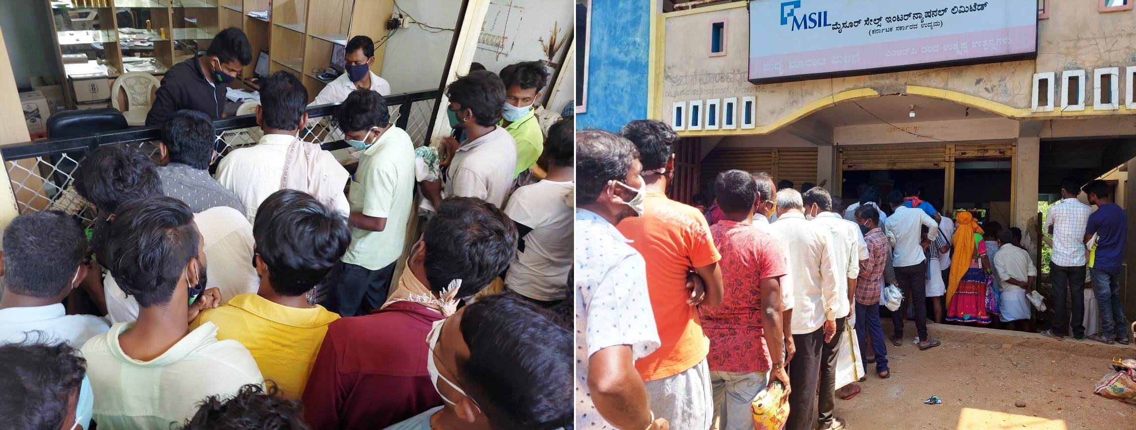 ಮತ್ತೆ ಮೂರು ದಿನಗಳ ಕಾಲ ಸಂಪೂರ್ಣವಾಗಿ ಲಾಕ್ಡೌನ್ ಘೊಷಣೆ ಆಗಿರುವುದನ್ನು ಮನಗಂಡ ಹಲವು ಕುಡುಕರು, ಮೂರು ದಿನಗಳ ಕಾಲ ಬೇಕಾಗುವಷ್ಟು ದಾಸ್ತಾನು ಸಂಗ್ರಹಿಸಿಕೊಳ್ಳಲು ಮುಂದಾಗಿದ್ದರು. ಗ್ರಾಮೀಣ ಪ್ರದೇಶದ ಹೆಣ್ಣು ಮಕ್ಕಳೂ ಬಾಟಲಿ ವ್ಯಾಪಾರಕ್ಕೆ ಒತ್ತು ನೀಡುತ್ತಿದ್ದು, ಖುದ್ದಾಗಿ ಮಹಿಳೆಯರೂ ಎಣ್ಣೆ ಕೊಳ್ಳಲು ನೂಕುನುಗ್ಗಲು ನಡೆಸಿದರು.