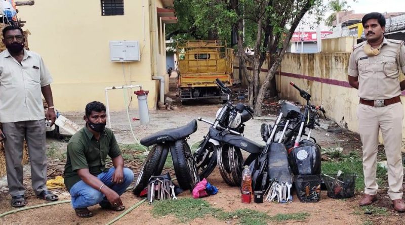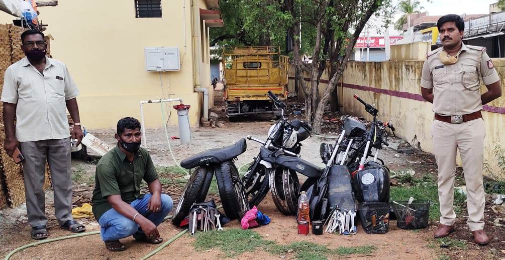 ಇತ್ತೀಚೆಗೆ ಪಟ್ಟಣದಲ್ಲಿ ಮನೆ ಮುಂದೆ ನಿಲ್ಲಿಸಿದ್ದ ಬೈಕ್ಗಳ ಪೆಟ್ರೋಲ್, ಸೀಟ್, ಟಯರ್, ಫ್ಯೂಯೆಲ್ ಟ್ಯಾಂಕ್ ಕಳ್ಳತನ ಮಾಡಿ ಈತನಿಗೆ ಮೂವರು ಬಾಲಕರು ಮಾರಾಟ ಮಾಡುತ್ತಿದ್ದರು. ಕಳುವಿನ ಸಾಮಗ್ರಿಗಳನ್ನು ಮುತ್ತು ಪಾಟೀಲ್ ಎನ್ನುವ ಮೆಕ್ಯಾನಿಕ್ ಖರೀದಿಸಿ ಬೇರೆ ಬೈಕ್ಗಳಿಗೆ ಜೋಡಿಸಿ ಮಾರಾಟ ಮಾಡುತ್ತಿದ್ದ. ಈತನಿಂದ 2 ಬೈಕ್, 2 ಸೀಟ್ ಕವರ್, 2 ಫ್ಯುಯೆಲ್ ಟ್ಯಾಂಕ್, 5 ವೀಲ್, 2 ಬ್ಯಾಟರಿ, ಪಾನರ್ಗಳು ಸೇರಿ ಸುಮಾರು 70 ಸಾವಿರ ರೂಪಾಯಿ ಬೆಲೆ ಬಾಳುವ ವಸ್ತುಗಳನ್ನು ವಶಕ್ಕೆ ತೆಗೆದುಕೊಳ್ಳಲಾಗಿದೆ. ಈತನಿಗೆ ಬೈಕ್ ಕದ್ದು ಮಾರಾಟ ಮಾಡುತ್ತಿದ್ದ ಕಳ್ಳರ ಪತ್ತೆ ಕಾರ್ಯ ನಡೆದಿದೆ ಎಂದು ಪೋಲಿಸ್ ಮೂಲಗಳು ತಿಳಿಸಿವೆ. ಪತ್ರಕರ್ತನೆಂದು ಹೇಳಿಕೊಂಡು ಓಡಾಡುತ್ತಿದ್ದ ಮುತ್ತು ಪಾಟೀಲ್ ಕೆಲವು ಪತ್ರಕರ್ತರೊಂದಿಗೆ ಓಡಾಡುತ್ತಿದ್ದ ಎನ್ನುವ ಮಾತುಗಳು ಪಟ್ಟಣದಲ್ಲಿ ಕೇಳಿ ಬರುತ್ತಿವೆ. ಈ ಬಗ್ಗೆ ಪೋಲಿಸರು ಹೆಚ್ಚಿನ ತನಿಖೆ ನಡೆಸಿದಾಗ ಸತ್ಯಾಸತ್ಯತೆ ಹೊರಬೀಳಲಿದೆ.