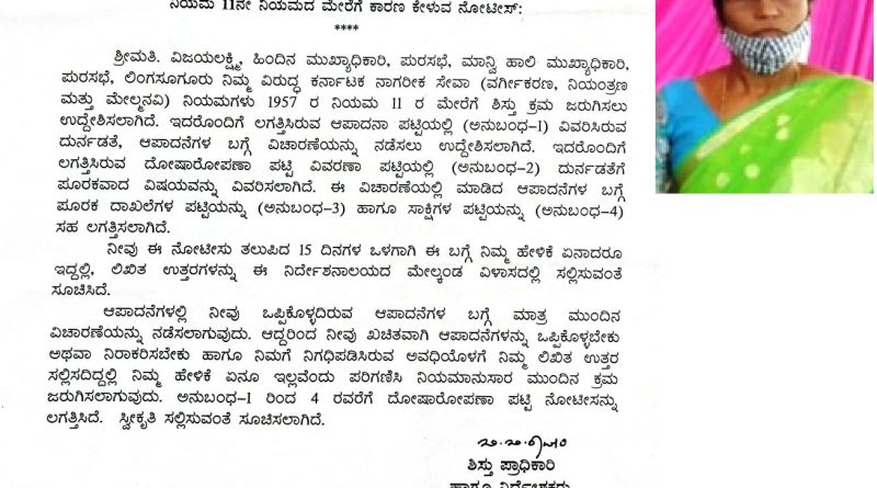 ಲಿಂಗಸುಗೂರು : ಸ್ಥಳೀಯ ಪುರಸಭೆ ಮುಖ್ಯಾಧಿಕಾರಿ ವಿಜಯಲಕ್ಷ್ಮಿಯವರಿಗೆ ಪೌರಾಡಳಿತ ನಿರ್ದೇಶನಾಲಯದ ಶಿಸ್ತು ಪ್ರಾಧಿಕಾರಿ ಹಾಗೂ ನಿರ್ದೇಶಕರು ಶೋಕಾಸ್ ನೋಟೀಸ್ ಜಾರಿ ಮಾಡಿದ್ದಾರೆ.