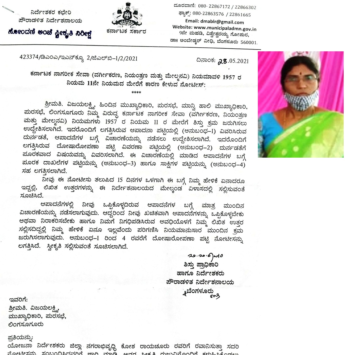 ಲಿಂಗಸುಗೂರು ಪುರಸಭೆಗೆ ಇವರು ಬರುವುದಕ್ಕೂ ಮುನ್ನ ಮಾನ್ವಿ ಪುರಸಭೆ ಮುಖ್ಯಾಧಿಕಾರಿಯಾಗಿದ್ದರು. ಮಾನ್ವಿ ತಾಲೂಕಿನ ಬಾಪೂರು ಗ್ರಾಮದ ಸ.ನಂ. 107/8/6ರಲ್ಲಿ 5.5 ಎಕರೆ ಜಮೀನು ಜಿಲ್ಲಾಧಿಕಾರಿಗಳಿಂದ ಭೂ ಪರಿವರ್ತನೆ ಆದೇಶವಾಗಿತ್ತು. ನಗರ ಯೋಜನಾ ಪ್ರಾಧಿಕಾರ ಮಾನ್ವಿಯವರು 81 ನಿವೇಶನಗಳನ್ನು ಮಂಜೂರು ಮಾಡಿ, ಶೇ.40ರಷ್ಟು ನಿವೇಶನಗಳನ್ನು ಬಿಡುಗಡೆ ಮಾಡಿದ್ದರು. ಆದರೆ, ಮುಖ್ಯಾಧಿಕಾರಿ ವಿಜಯಲಕ್ಷ್ಮಿಯವರು ಶೇ.100ರಷ್ಟು ನಿವೇಶನಗಳನ್ನು ಬಿಡುಗಡೆ ಮಾಡಿ ಸರಕಾರಕ್ಕೆ ಆರ್ಥಿಕ ನಷ್ಟವನ್ನುಂಟುಮಾಡಿದ್ದಾರೆ. ಅಲ್ಲದೇ, ಕೆಲಸದ ಅವಧಿಯಲ್ಲಿ ಸಾರ್ವಜನಿಕರೊಂದಿಗೆ ದುರ್ನಡತೆಯಿಂದ ವರ್ತಿಸುತ್ತಿದ್ದಾರೆಂದು ಸಾಕ್ಷಿ ಸಮೇತ ದೂರು ಬಂದ ಹಿನ್ನೆಲೆಯಲ್ಲಿ ಕಾರಣ ಕೇಳಿ ನೋಟೀಸ್ ನೀಡಲಾಗಿದೆ. ಬರುವ 15 ದಿನಗಳೊಳಗೆ ಲಿಖಿತವಾಗಿ ಉತ್ತರ ನೀಡಬೇಕೆಂದು ಮೇ 28ರಂದು ನೀಡಿದ್ದ ನೋಟೀಸ್ನಲ್ಲಿ ಎಚ್ಚರಿಸಿದ್ದಾರೆ.