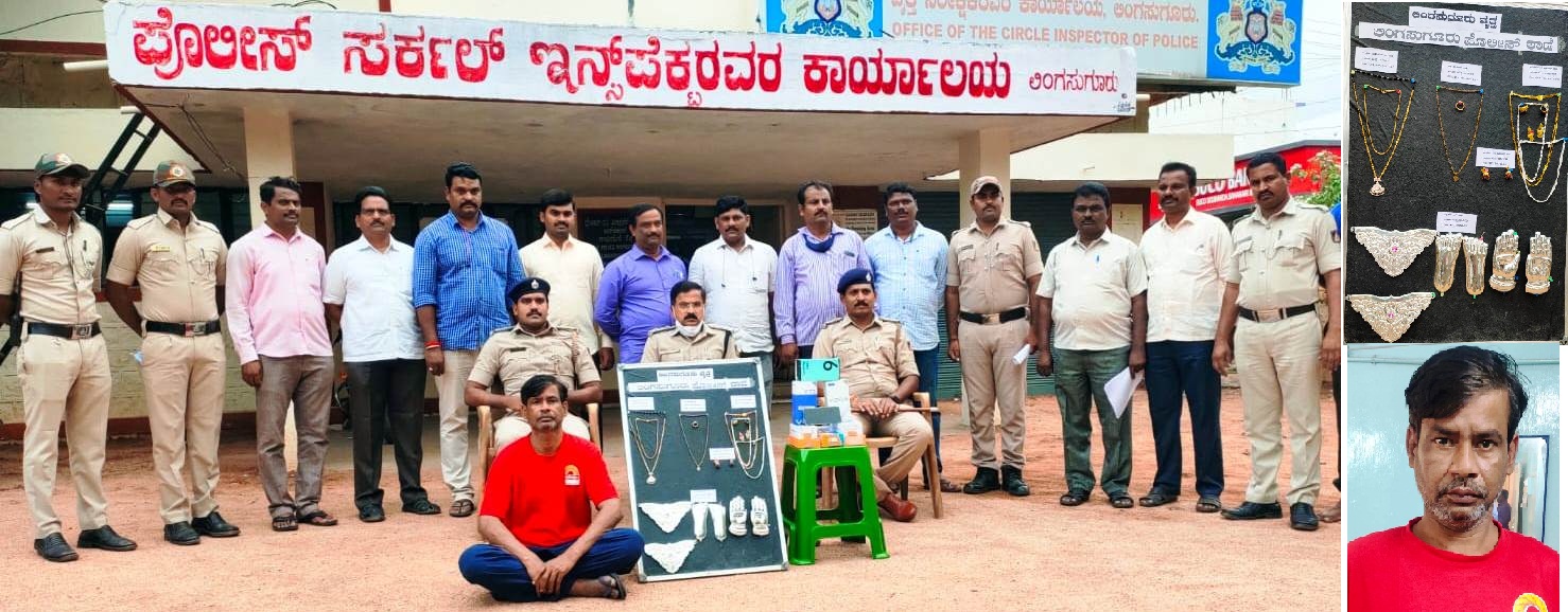 ಕಳ್ಳನಿಂದ 1.38 ಲಕ್ಷ ರೂಪಾಯಿ ಬೆಲೆಬಾಳುವ 9 ಮೊಬೈಲ್ಗಳು, ಹಟ್ಟಿ ಪೋಲಿಸ್ ಠಾಣೆ ವ್ಯಾಪ್ತಿಯ 4 ಪ್ರಕರಣಗಳಲ್ಲಿ 4 ಲಕ್ಷ ರೂಪಾಯಿ ಬೆಲೆಬಾಳುವ 100 ಗ್ರಾಂ ಬಂಗಾರ ಹಾಗೂ 2500 ರೂಪಾಯಿ ಬೆಲೆಯ 40 ಗ್ರಾಂ ಬೆಳ್ಳಿ ಆಭರಣಗಳನ್ನು ಮತ್ತು ಗುರುಗುಂಟಾ ಅಂಬಾದೇವಿ ದೇವಸ್ಥಾನದಲ್ಲಿ 32 ಸಾವಿರ ರೂಪಾಯಿ ಬೆಲೆಬಾಳುವ 470 ಗ್ರಾಂ ಬೆಳ್ಳಿ ಹಾಗೂ ಬಂಗಾರದ ಸಾಮಾನು ಸೇರಿ ಒಟ್ಟು 5.72 ಲಕ್ಷ ರೂಪಾಯಿ ಮೌಲ್ಯದ ವಸ್ತುಗಳನ್ನು ಜಪ್ತಿ ಮಾಡಿಕೊಳ್ಳಲಾಗಿದೆ.